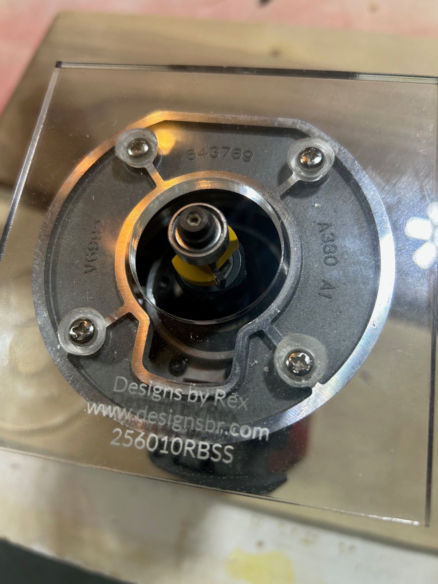 Center hole is ~1.19" if you need a specific size to fit a bushing guide or other insert let us know other wise we ship with these dimensions. This center hole is compatible with most standard 1 3/16" bushing guides. Screw holes are recessed ~.125"