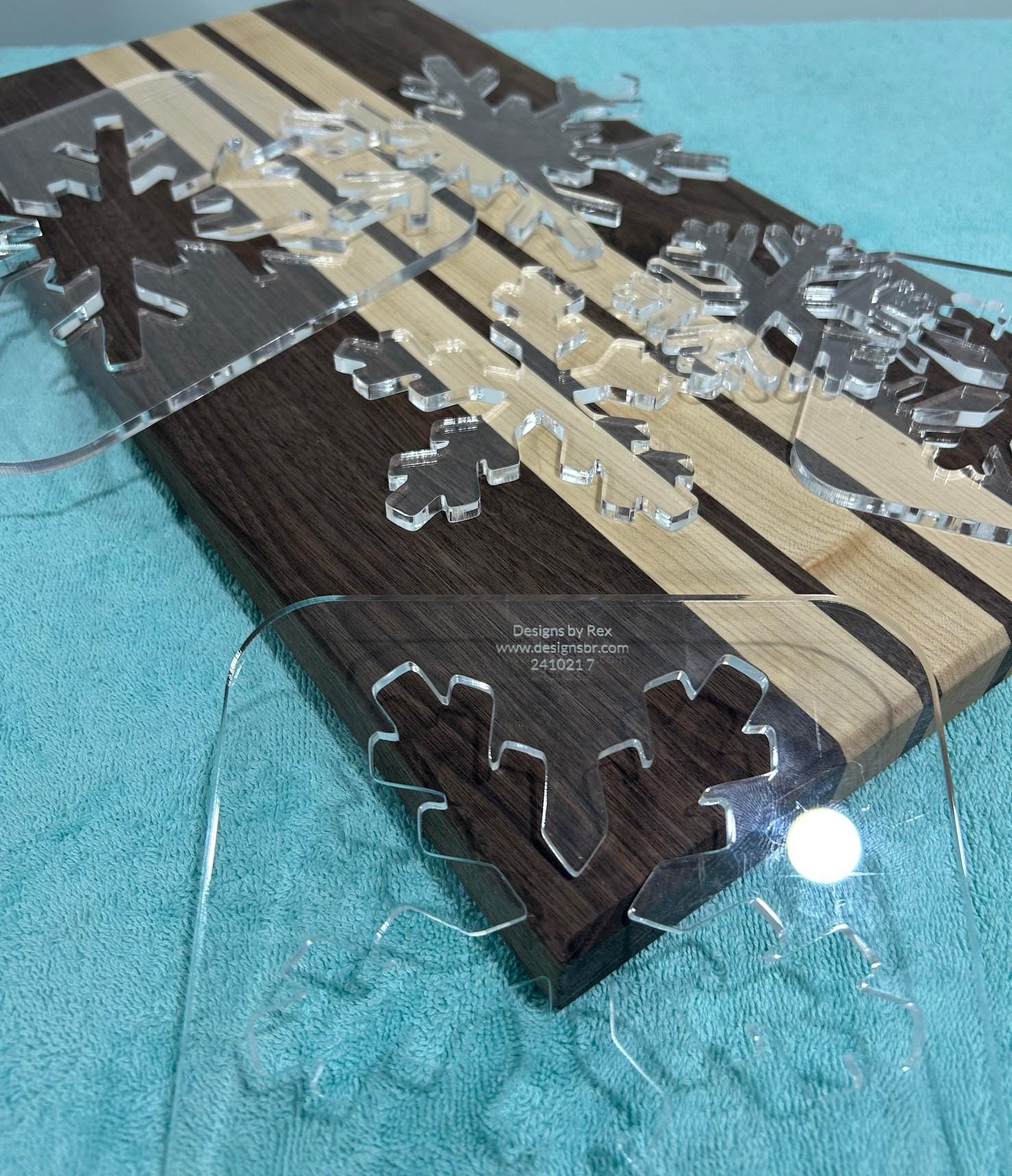Snowflake Router Templates laser cut from 1/4" clear acrylic. These are great for customizing charcuterie boards, inlays and other woodworking projects. Christmas and Holiday Snowflake templates are made from high quality cast acrylic these are durable and can be used again and again. All pieces are included with purchase (template and cutout) this allows for greater flexibility for your project, inlays, tracing, pocketing and more.